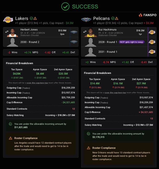 他的方案是湖人送出八村垒+2028年首轮互换权+2031年不保护首轮签,得到琼斯+2030年次轮签,这笔交易鹈鹕等于得到两个首轮签,湖人拿出了最大的诚意。这样琼斯就可以打先发三号位,防守最好的先发斯玛特、东契奇、琼斯、詹姆斯、艾顿。